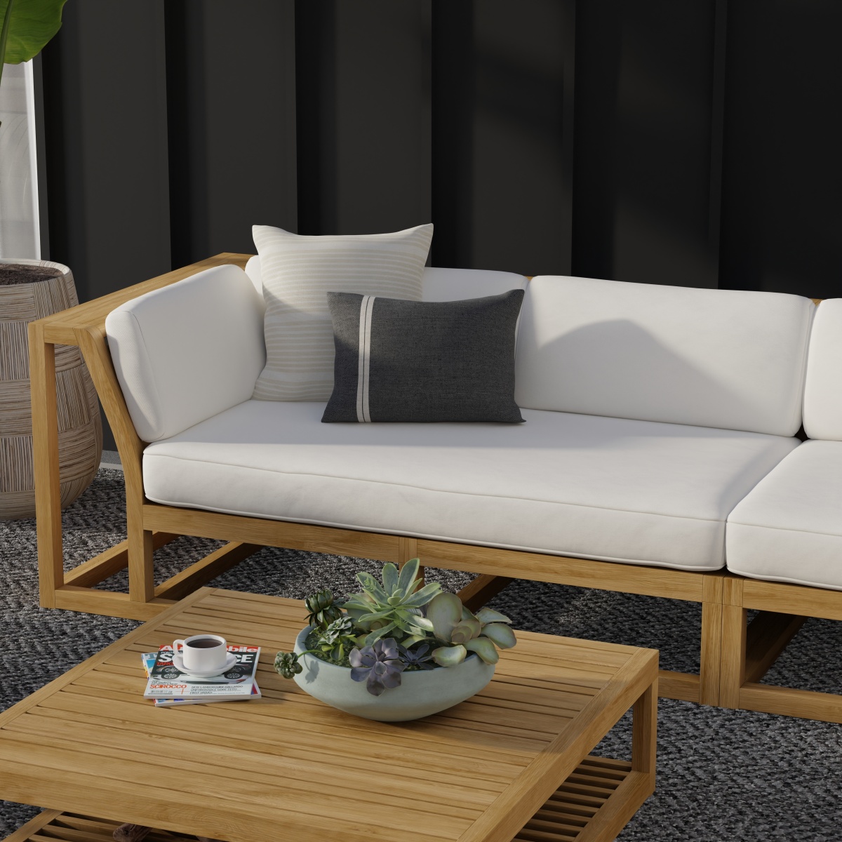 Cushions made with Quick Dry Foam® core and 100% solution dyed Sunbrella fabrics. Crafted with SVLK certified Grade A Teak, harvested from sustainable plantations in Indonesia. Every piece is precision manufactured to standard specifications for commercial and residential use.